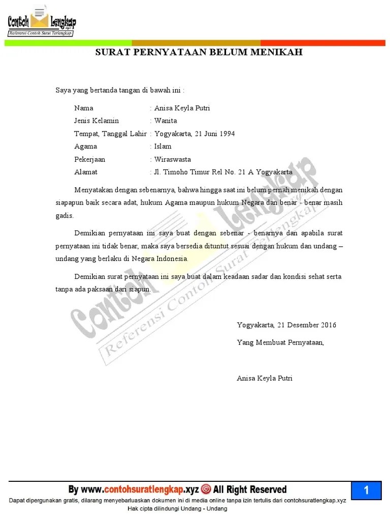Contoh surat pernyataan adalah surat yang digunakan untuk menyatakan sesuatu kepada penerima. Download contoh surat keterangan belum menikah format doc. Sekian dulu penjelasan mengenai surat keterangan belum menikah pada kesempatan kali ini. Itu tadi penjelasan singkat beserta contoh surat pernyataan belum menikah. Contoh surat keterangan belum menikah dari kepala desa 034 018 pwk viii 2012 yang bertanda tangan dibawah ini kepala desa puwehuko kecamatan mowila kabupaten konawe selatan menerangkan bahwa.